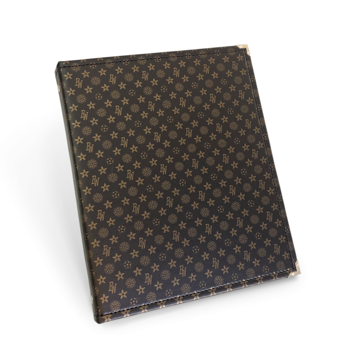 Produzida com capa dura cartonada e revestida em courvin resistente e impermeável, é feita a mão com acabamento todo em costura e cantoneiras de metal.