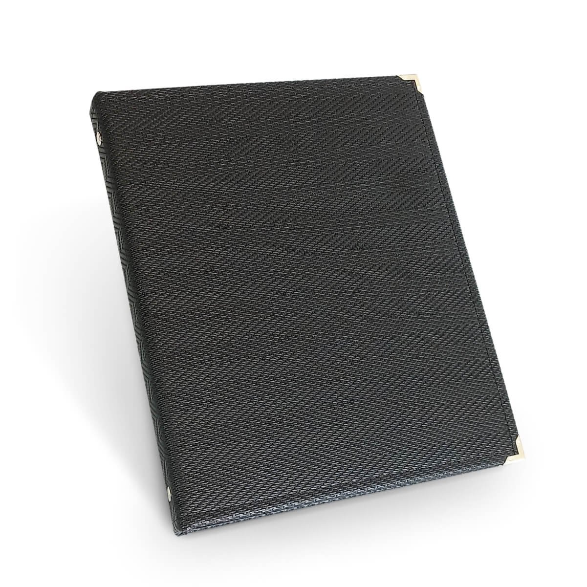 Produzida com capa dura cartonada e revestida em courvin resistente e impermeável, é feita a mão com acabamento todo em costura e cantoneiras de metal.